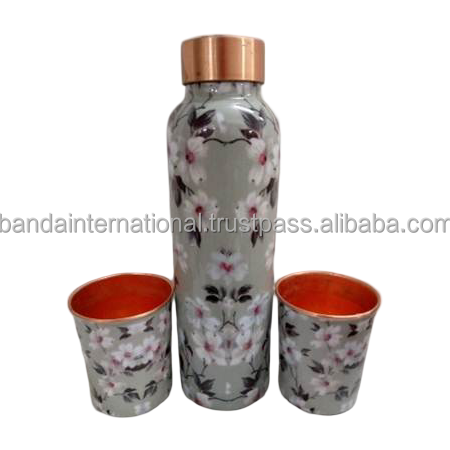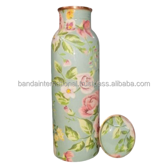 Botella de cobre con etiqueta y acabado pulido, hecha a mano en India, con beneficios para la salud, botella de agua potable de cobre puro.