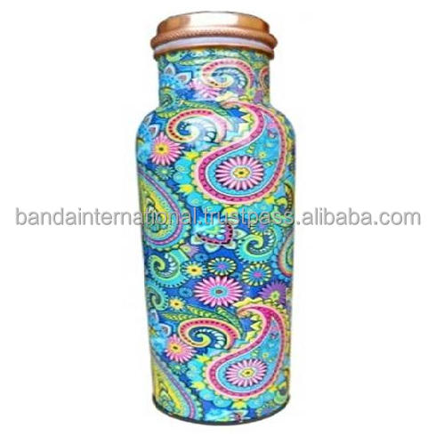 Botella de cobre con etiqueta y acabado pulido, hecha a mano en India, con beneficios para la salud, botella de agua potable de cobre puro.