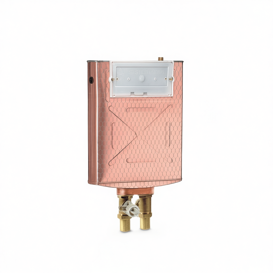 Cisterna empotrada de cobre de 10 litros con doble pulsador, tanque de inodoro de 63 cm de largo, 43 cm de ancho y 10 cm de alto.