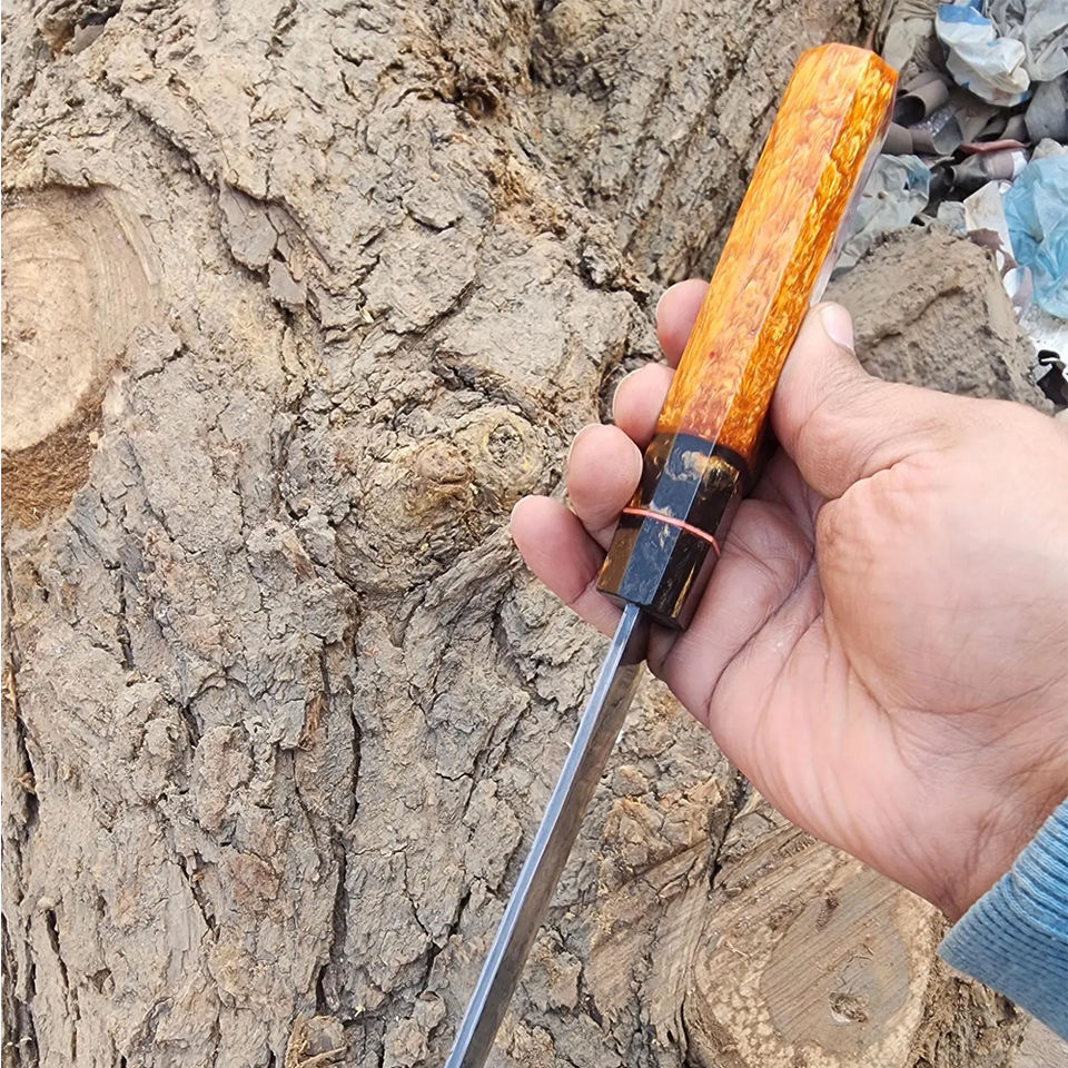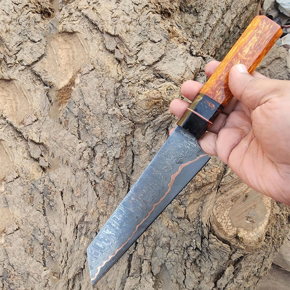 Cuchillo de chef para exteriores con patrón de cobre damasco y diseño de mango moderno para viajes y campamentos
