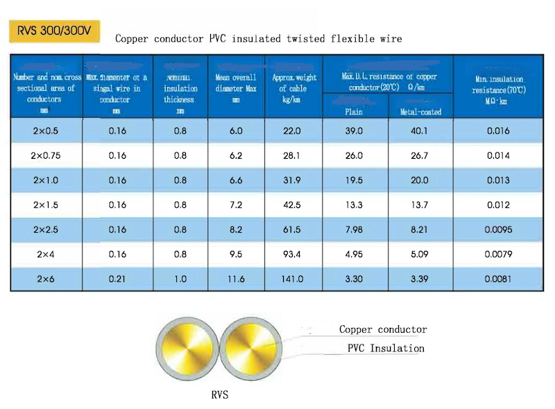 Cable de alimentación de Pvc de doble núcleo de cobre Rvs 300V 22awg Cables de 2 núcleos Cable sólido Cable aislado de baja electricidad