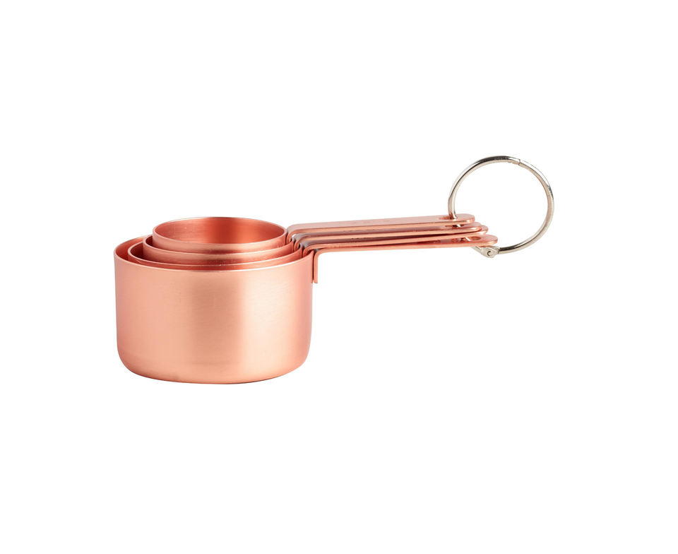Juego de 4 cucharas medidoras con acabado de cobre con soporte para anillos, elegante, duradero, Ideal para hornear, cocinar y accesorios de cocina