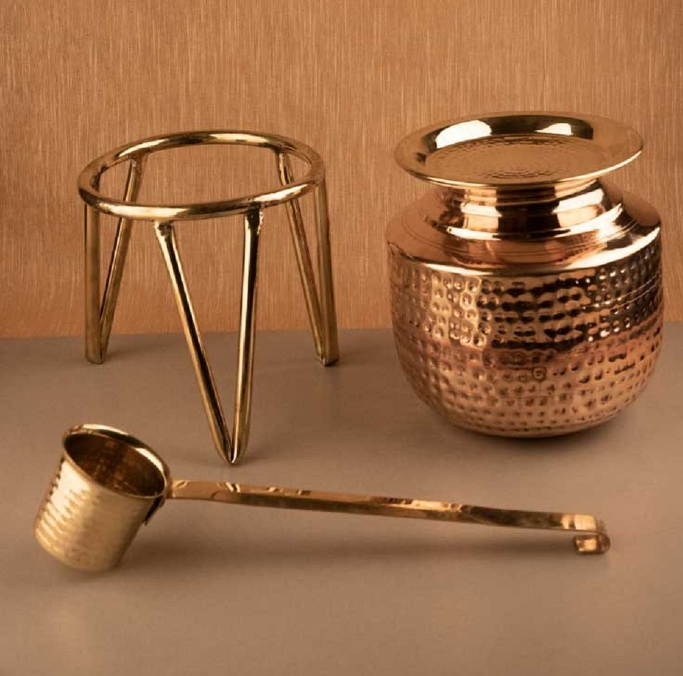Dispensador de ollas martilladas con agua de cobre con soporte de metal impreso con flores y 3 vasos de 4 litros, olla de agua de cobre