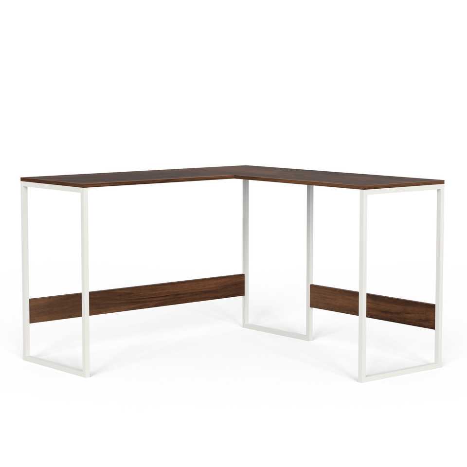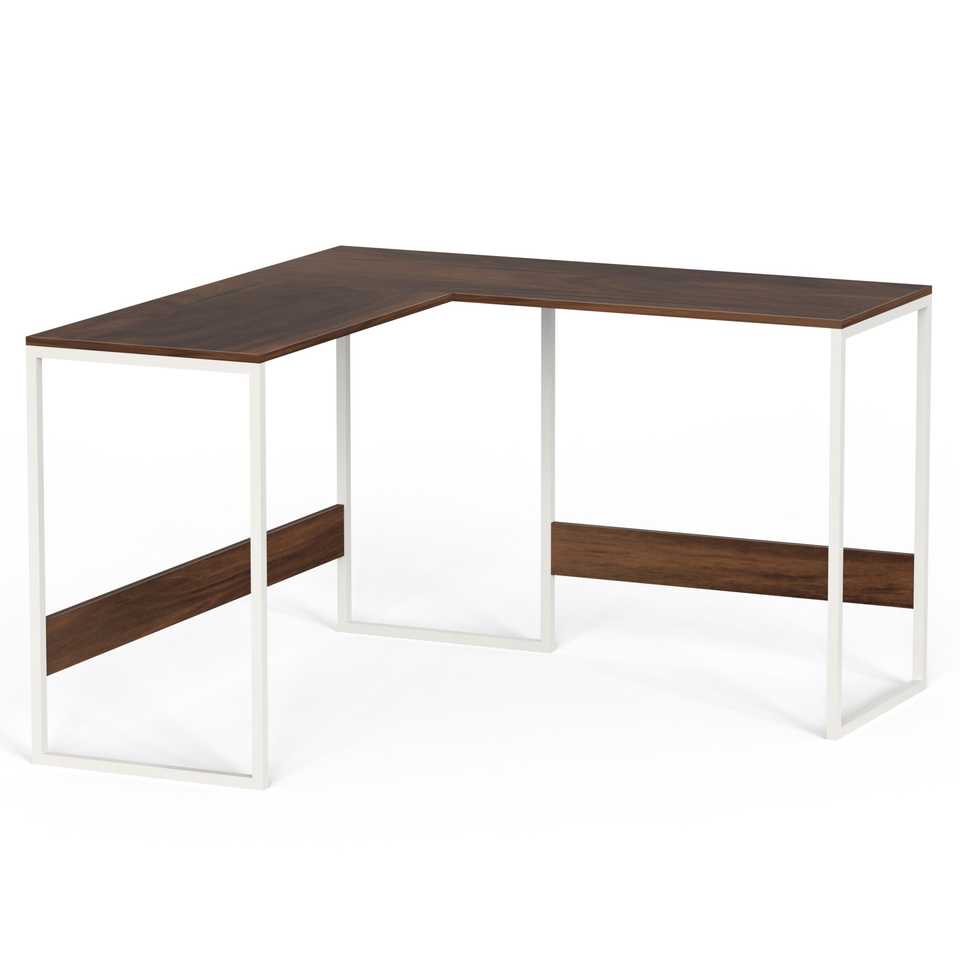 Escritorio para Computadora en Forma de L Corbyn, Color Marrón Maple, con Patas de Metal Blancas, Ideal para el Hogar o la Oficina, Compatible con WFH
