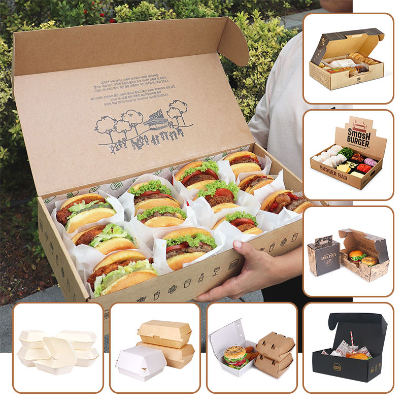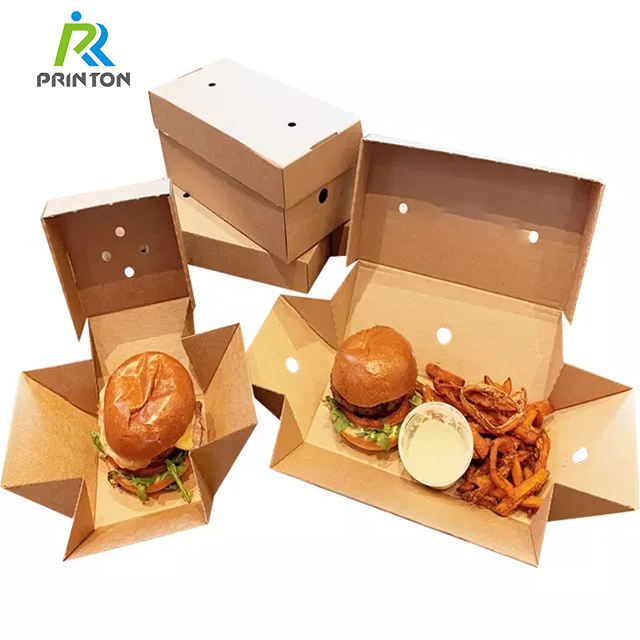 Caja de hamburguesas corrugada, embalaje personalizado de comida rápida para llevar, fiambrera para hamburguesas, logotipo impreso, papel Kraft desechable