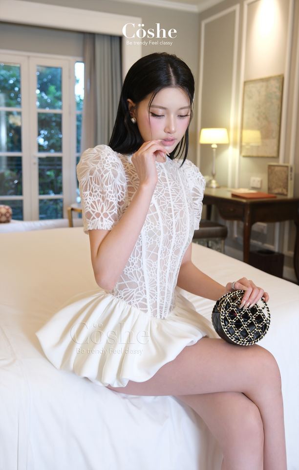 Vestido Coshe Rina elegante vestido de encaje de manga corta con dobladillo de burbuja diseño femenino y juvenil fiesta evento ropa informal Mujer
