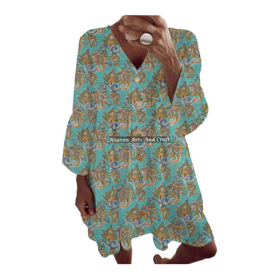 Vestido Túnica de Algodón con Estampado de Bloques, Vestido de Diseñador para Primavera/Verano, Ropa de Mujer, Estilo Boho Hippie, Vestido Casual para Primavera/Verano
