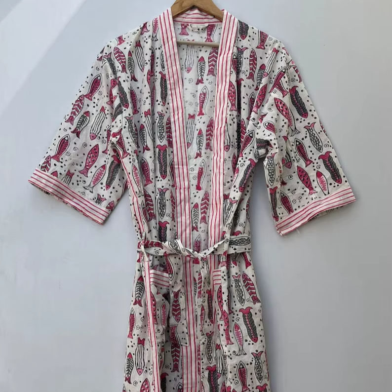 Kimono largo de algodón con cuello en V, estampado a mano, para playa, estilo bohemio, para mujer, secado rápido, para verano y primavera