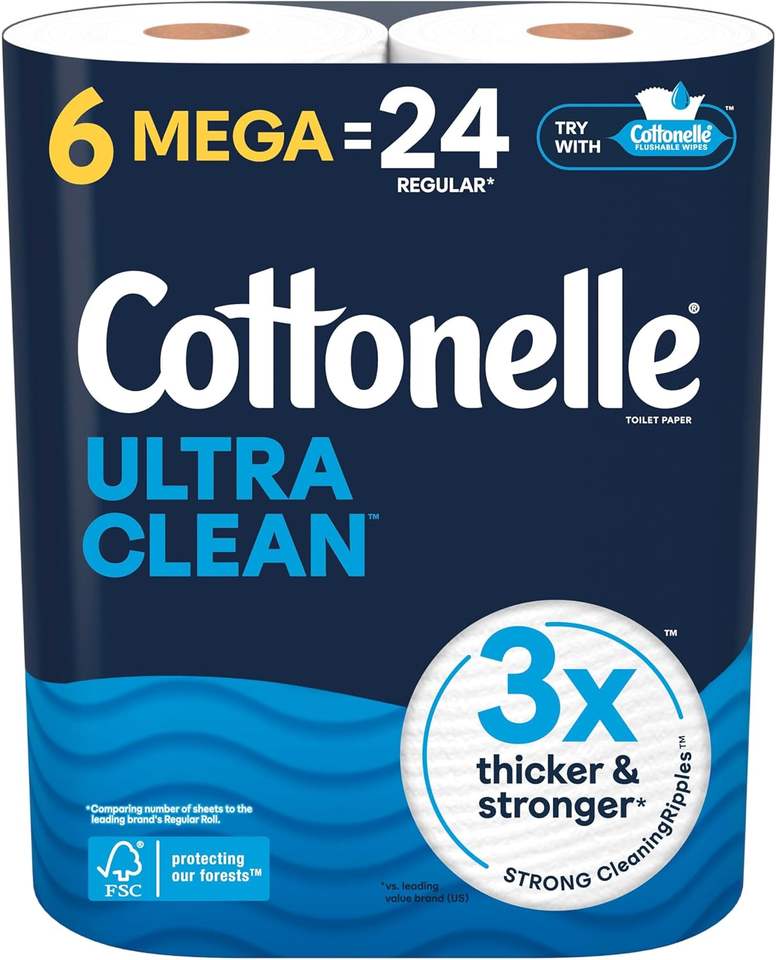 Papel Higiénico Cottonelle Ultra Clean, 6 Mega Rollos = 24 Rollos Regulares, el Empaque Puede Variar