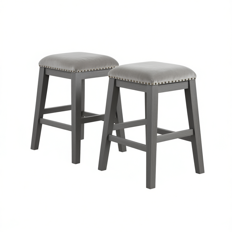 Juego de 2 taburetes de barra con altura de mostrador, tapicería de chenilla gris, moldura con remaches, estructura de madera, muebles informales para comedor