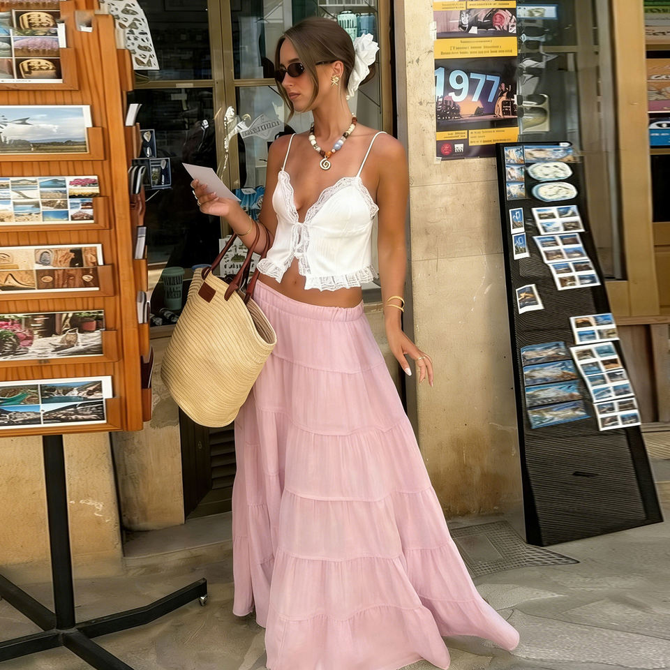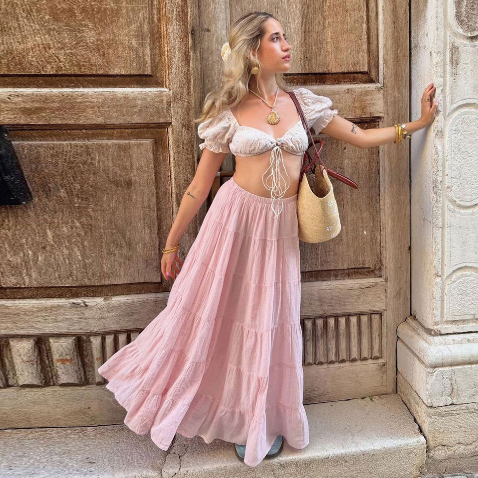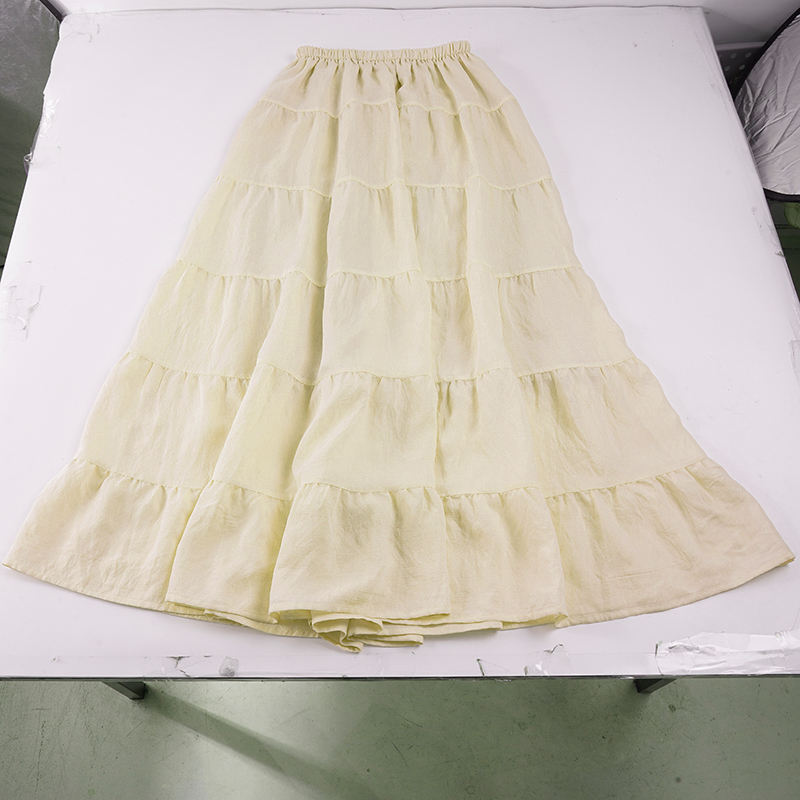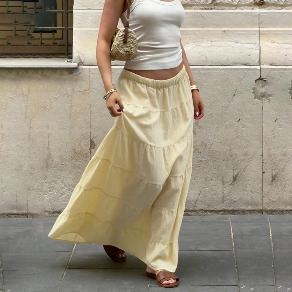 Country Fresh Solid Color A Line Elastic Tiered Midi Skirt Soft Versatile Vacation Style Casual Long Skirt