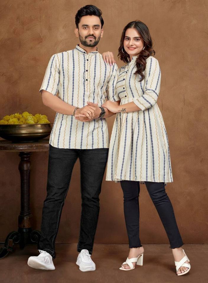 Pareja Festival Season Combo Hombres Jacquard Border Kurta Camisa y túnica de mujer Estilo de ropa india y pakistaní
