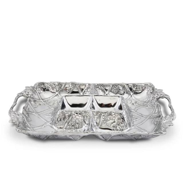 Court Designs Grape Entertainment Tray es una pieza de servicio de aluminio hecha a mano diseñada con intrincados detalles de vid de uva