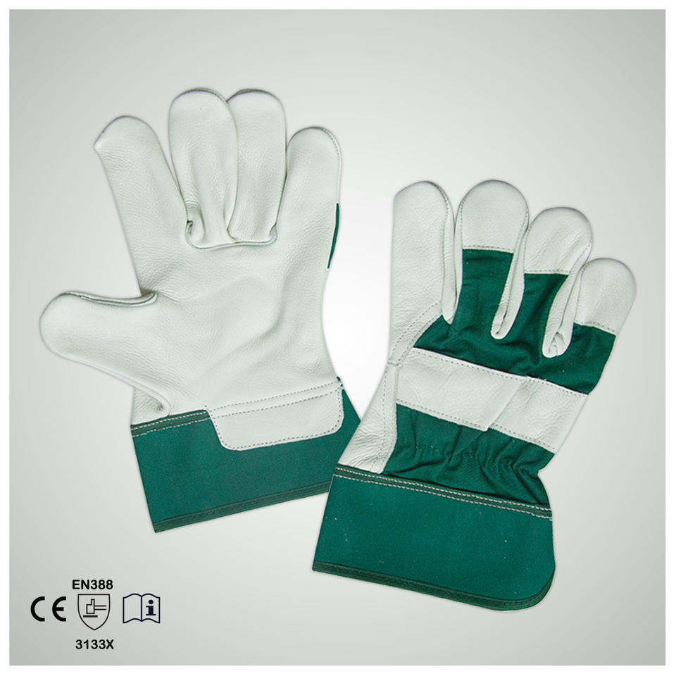 Guantes de Trabajo de Cuero Vacuno Dividido, Lisos y Duraderos, con Doble Refuerzo Verde en la Palma, Puño Reforzado con Goma, Resistentes al Calor y al Fuego