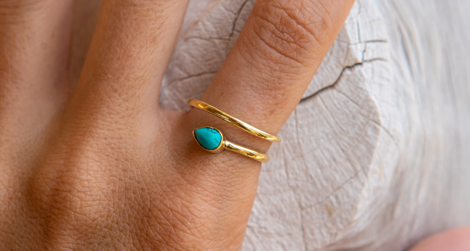 Elaborado a mano, anillo ajustable, Plata estándar chapada en oro, gemas en forma de pera turquesa, juego de bisel de 5X7MM para regalo de aniversario