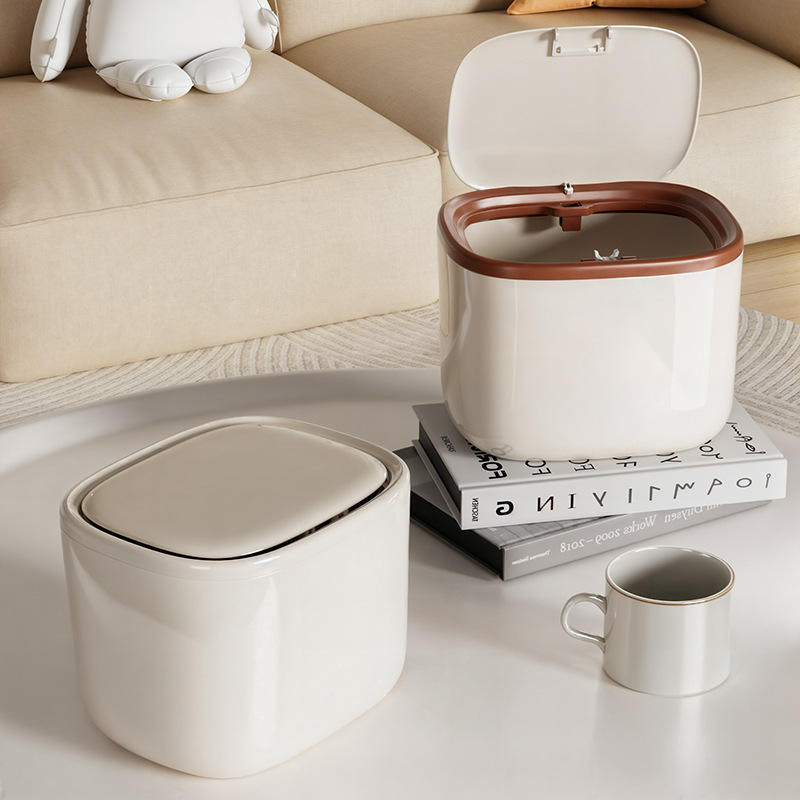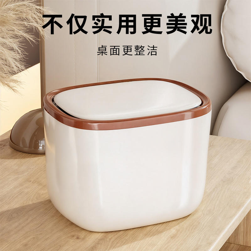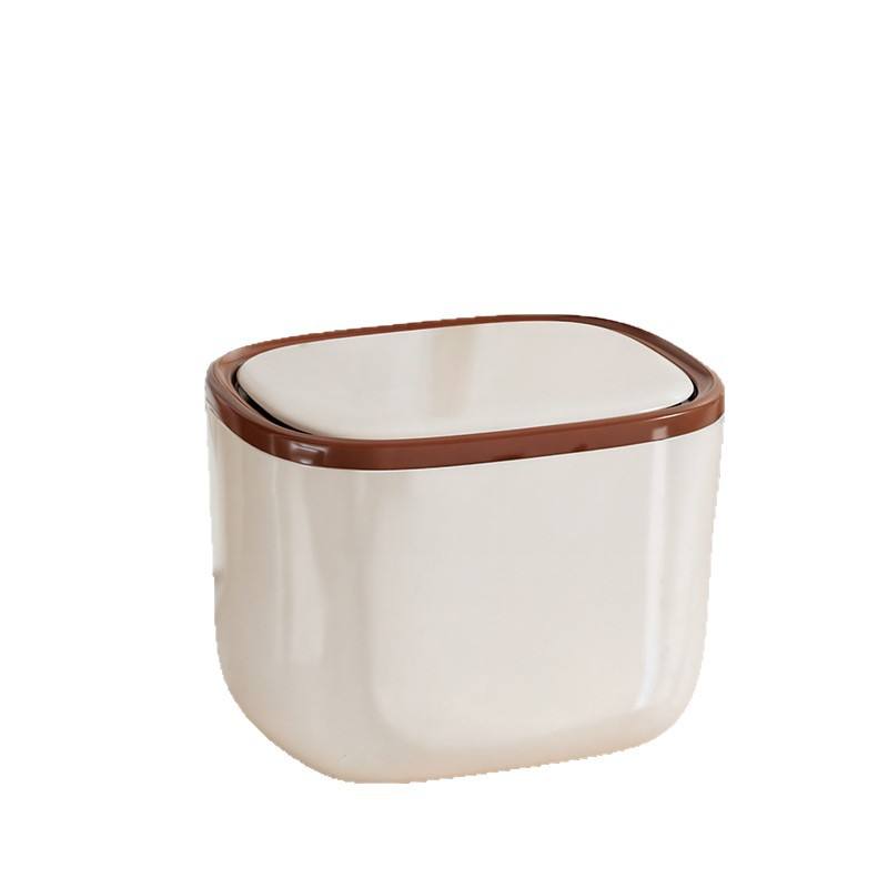 Bote de basura de escritorio de color crema, rectangular, 4L, con tapa, botón pulsador, mini bote de basura para almacenamiento en el hogar y el coche