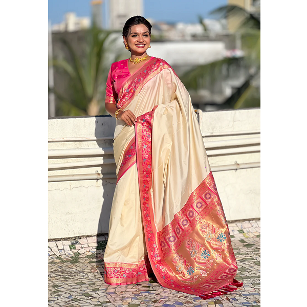 Sari de seda Cream Gala con ricos bordes tejidos Paithani Pallu y Kadiyal Zari para una mezcla de elegancia atemporal tradicional