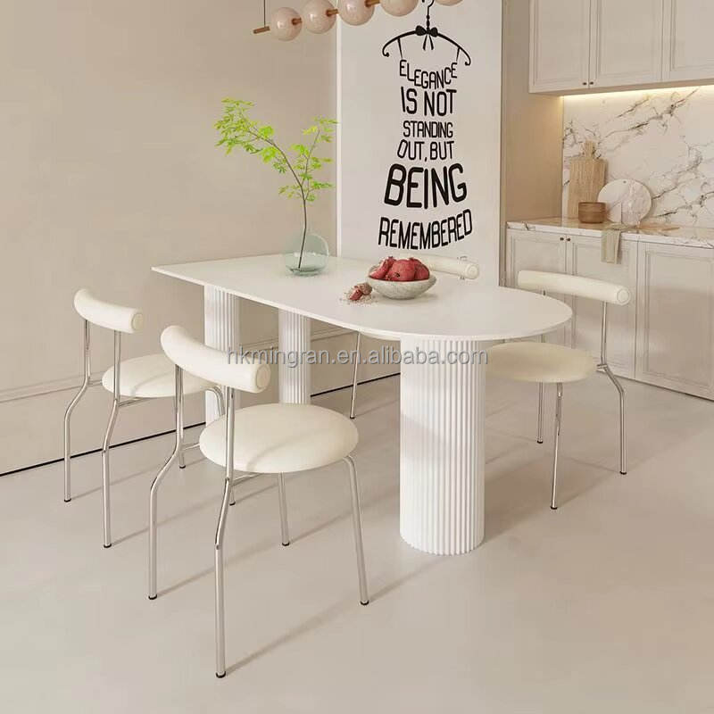 Juego de Mesa y Sillas de Comedor de Piedra Blanca Pura Estilo Crema, Mesa de Comedor Semicircular Moderna, Minimalista y Compacta para el Hogar