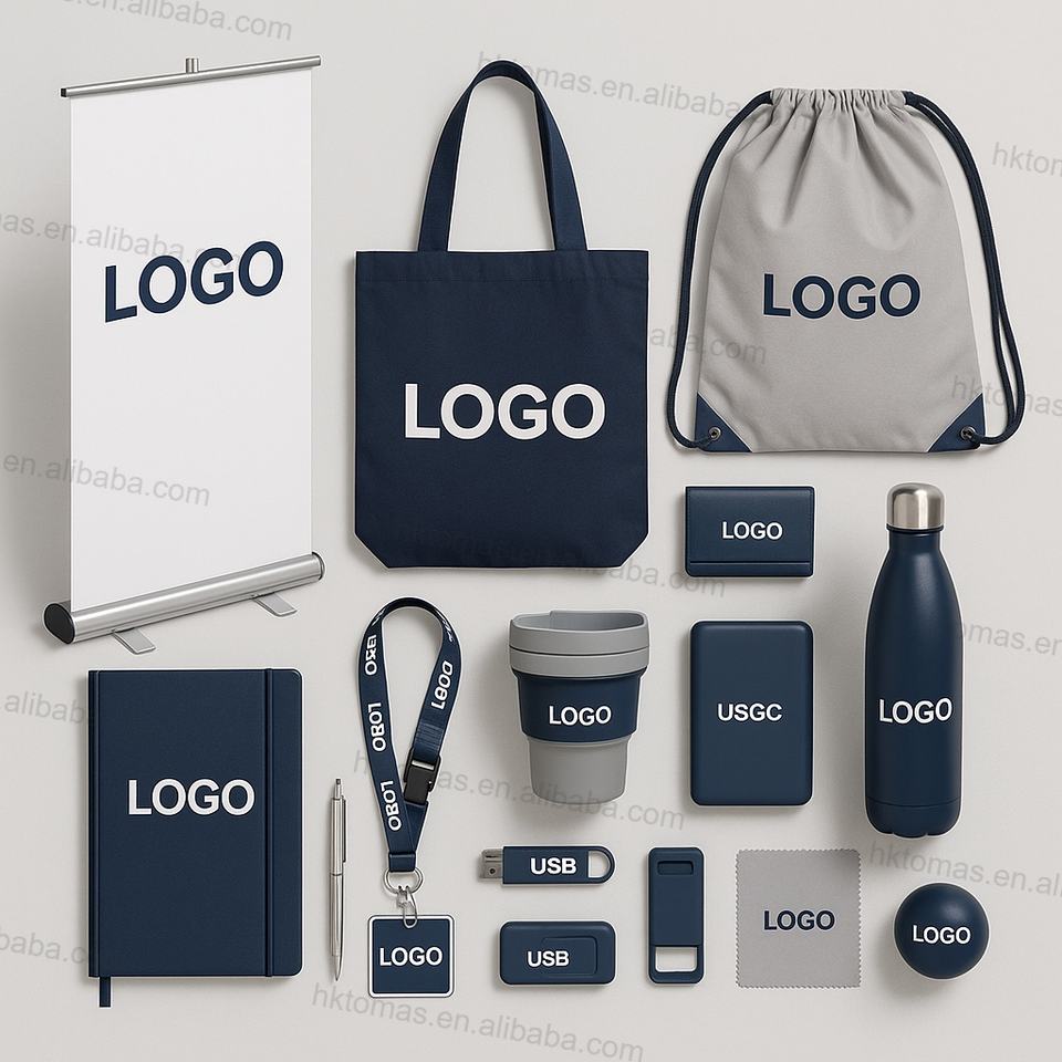Soluciones de regalo corporativas creativas que incluyen botellas de agua, papelería, unidades USB y bolsas de regalo para campañas de marketing