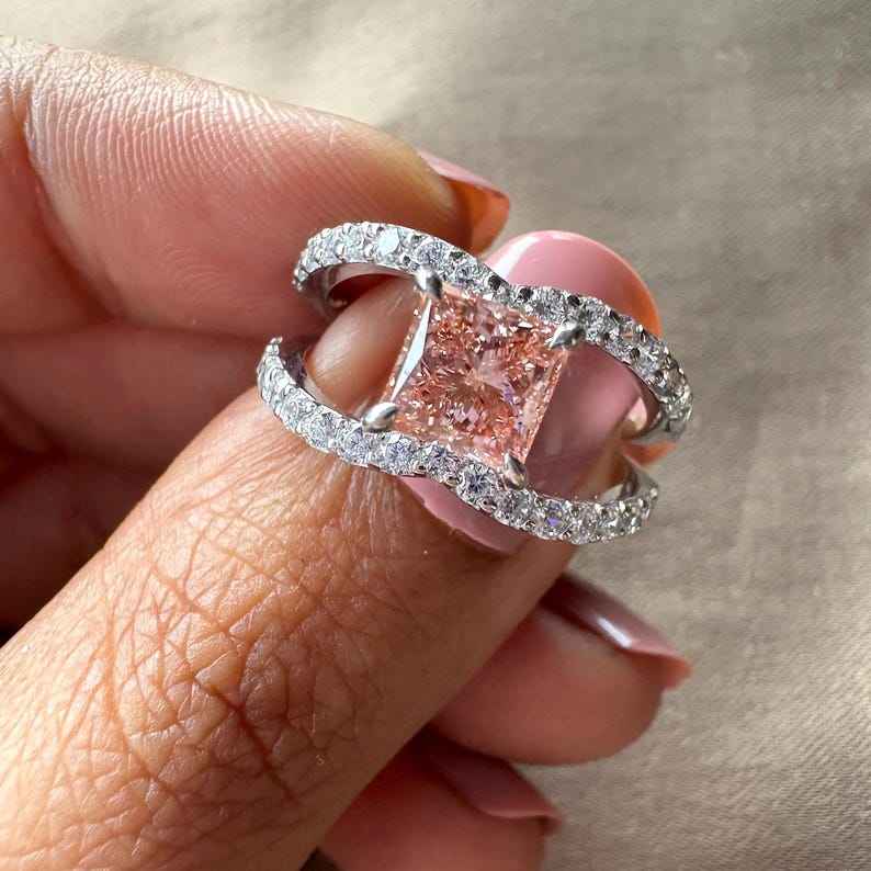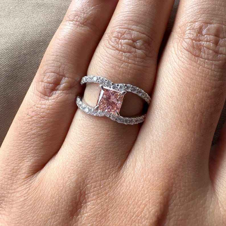 Anillo llamativo de moissanita con corte princesa rosa