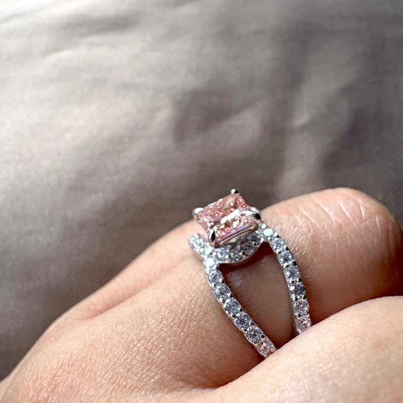 Anillo de compromiso y promesa de plata 925 con moissanita rosa de corte princesa, diseño creativo y elegante, de doble banda, para mujer.