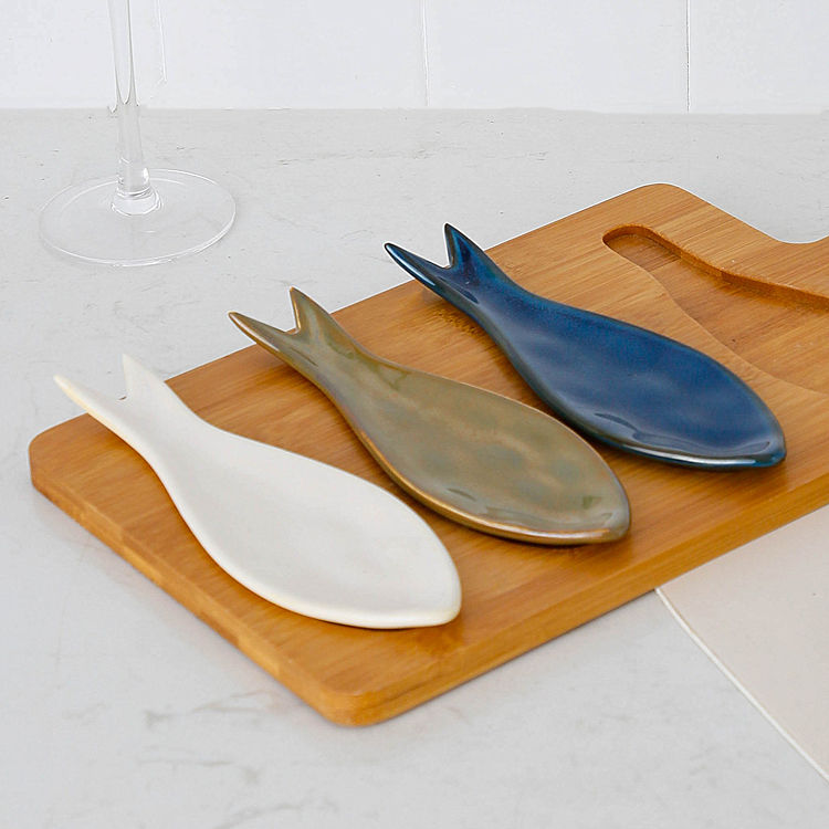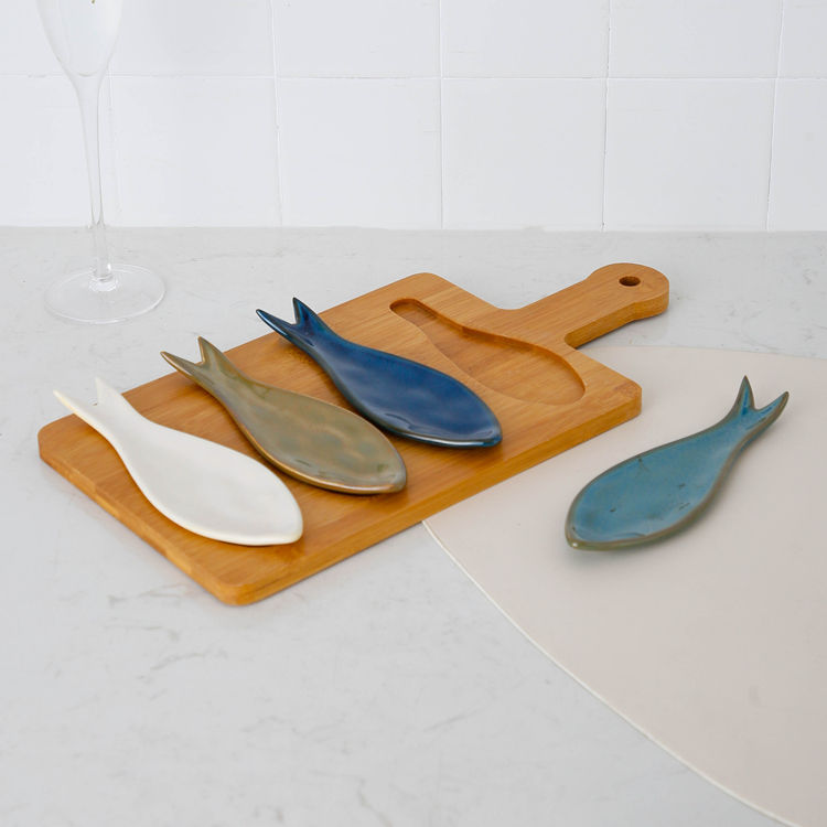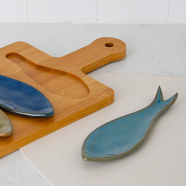 Plato de cerámica con esmalte reactivo en forma de pez para aperitivos, con bandeja de madera