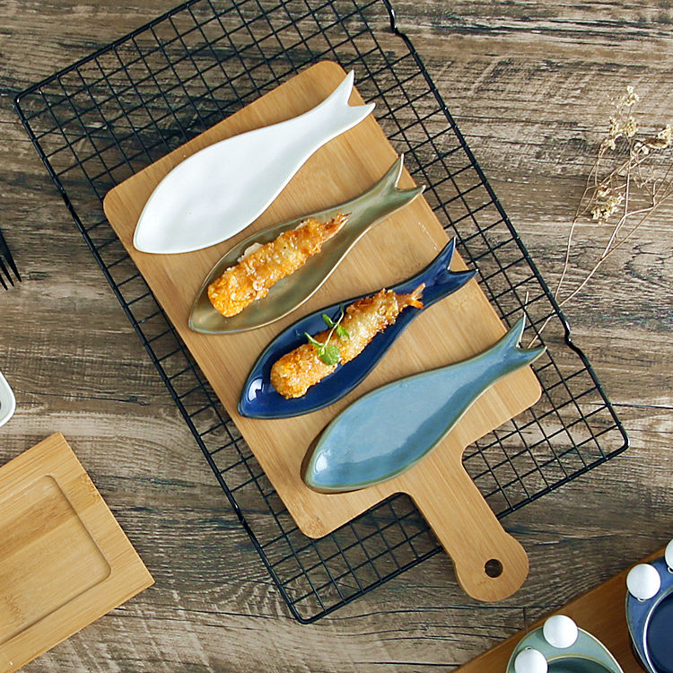 Plato de cerámica con esmalte reactivo para decoración del hogar, plato de aperitivo con forma de pescado para restaurante, juego de servicio usado con bandeja de madera