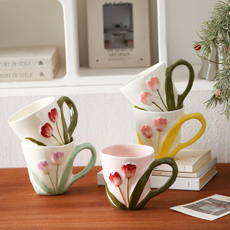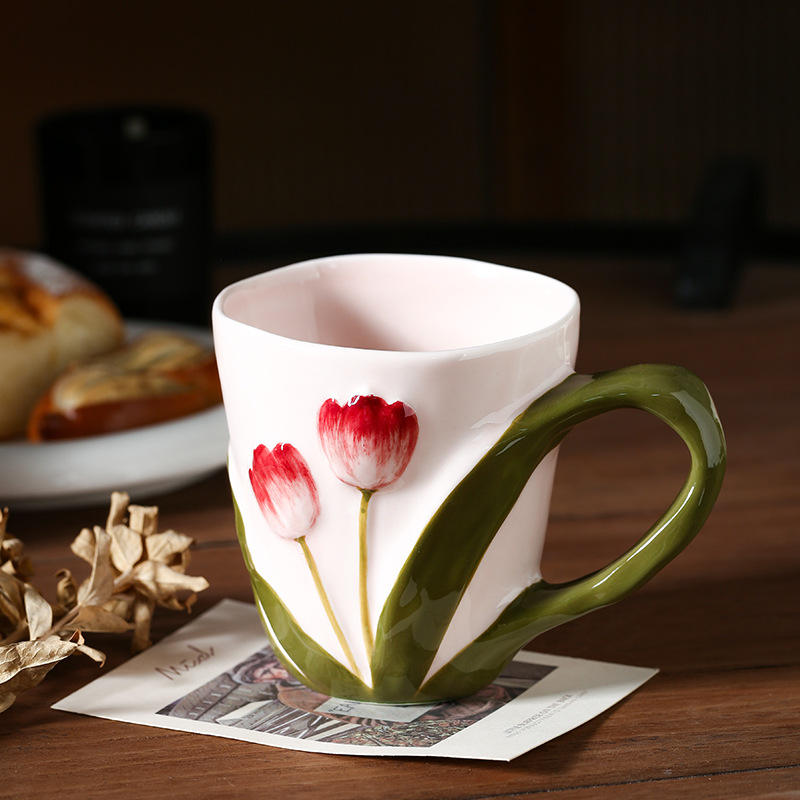Creative Hand-Painted Tulip Ceramic Mug 500ml Large Capacity Embossed Flower Coffee Cup