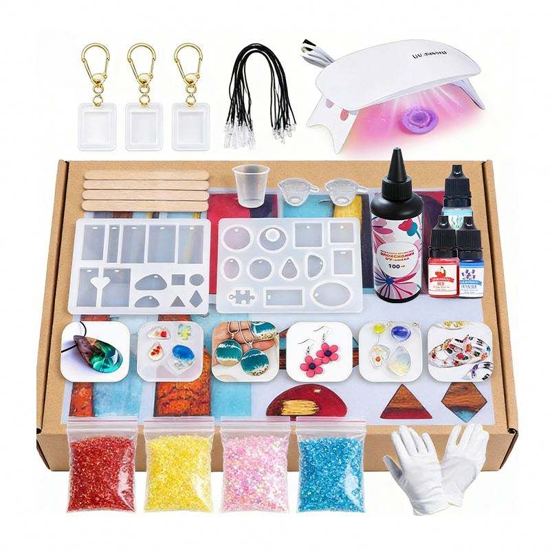 Kit de Silicona para Creación de Joyería, con Silicona Transparente de Curado Rápido, Lámpara UV, Moldes para Aretes y Colgantes, Brillo