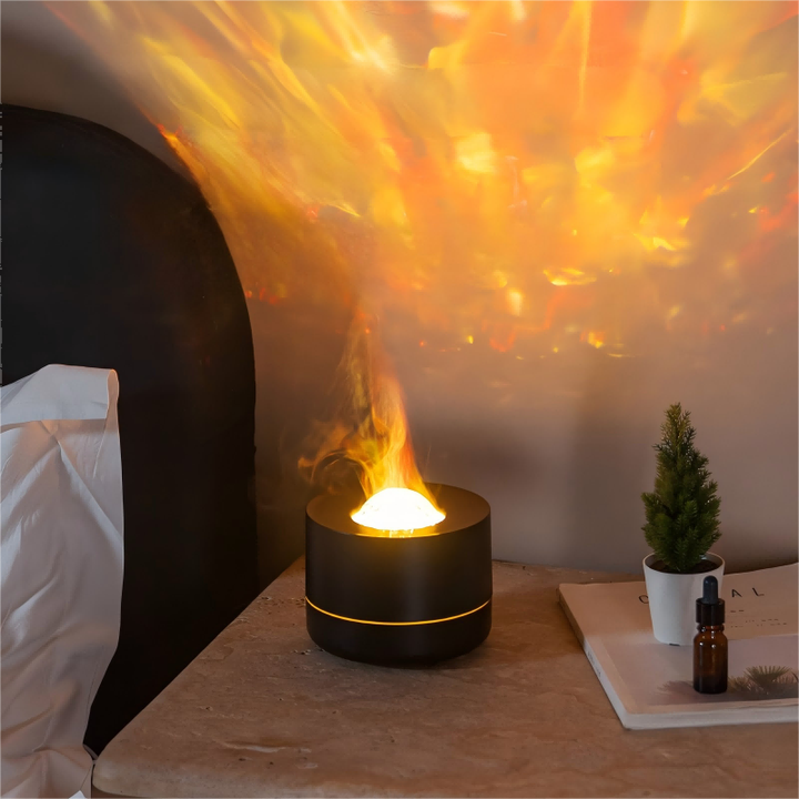 Difusor de Aroma Creativo con Proyector de Olas Oceánicas y Llama de Fuego, Difusor de Perfume de Aceites Esenciales para el Hogar, Humidificador de Aire LED Colorido para Habitaciones