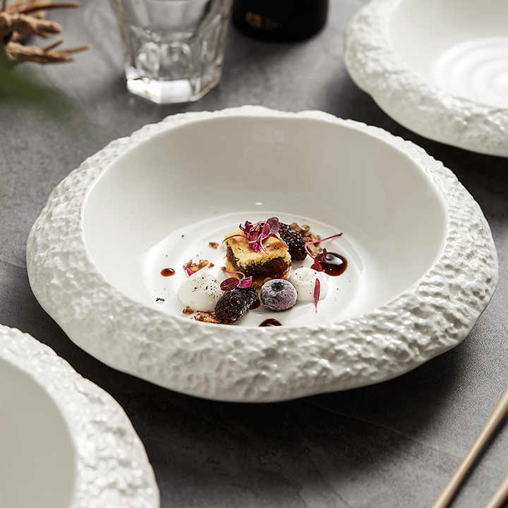 Plato de cerámica redondo blanco con borde de roca creativo para el hogar, Hotel y restaurante, vajilla para ensalada de espagueti, sopa de postre dulce