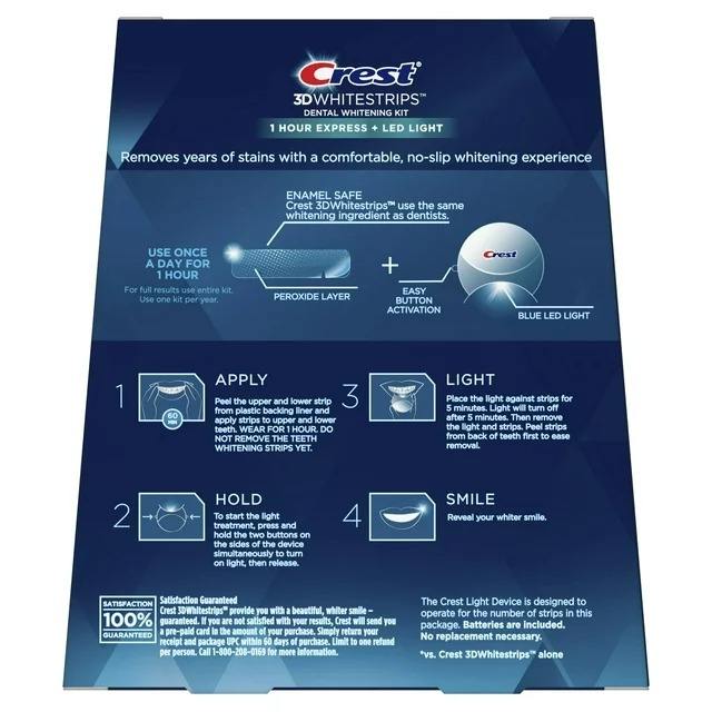 Crest 3DWhitestrips 1 Hour Express + Kit de Tiras Blanqueadoras con Luz LED, 19 Tratamientos