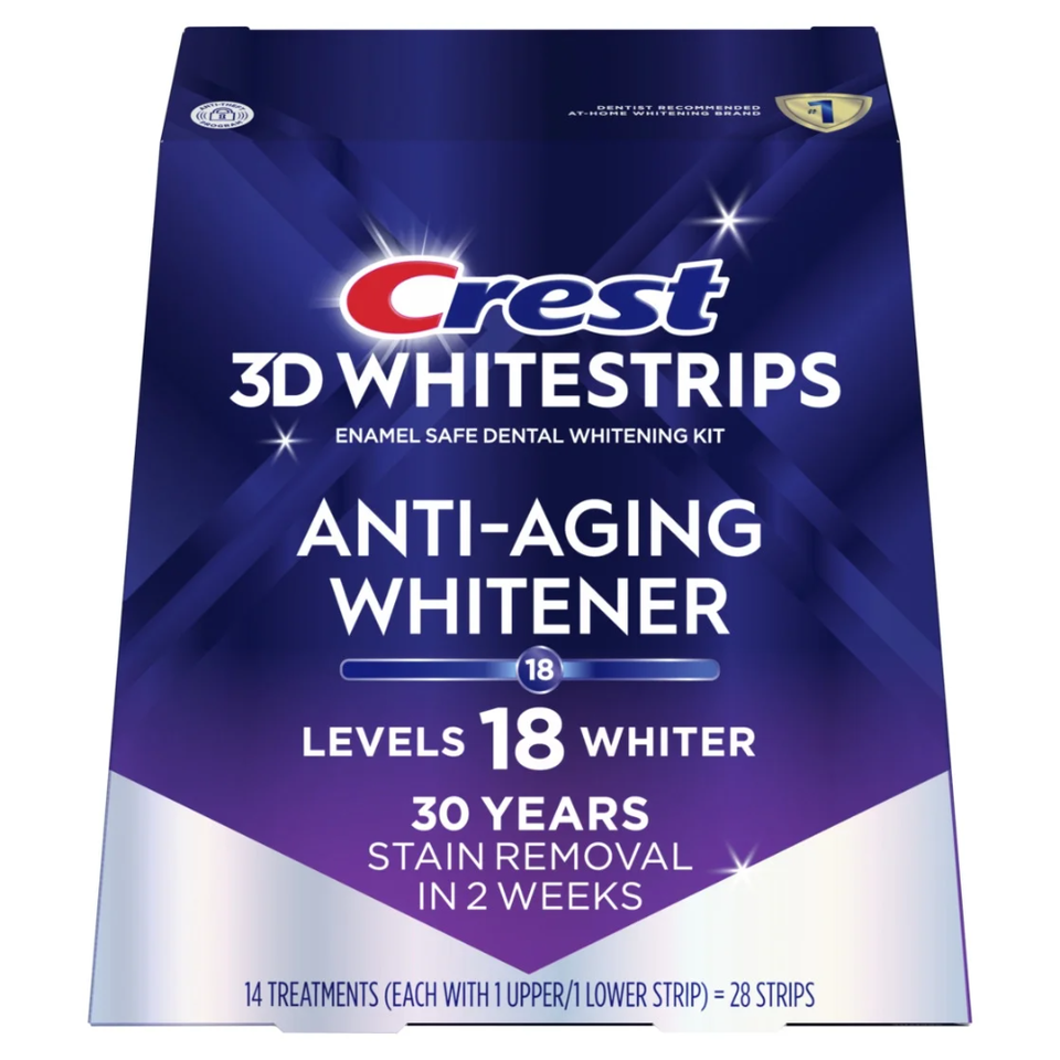 Crest3D Tiras blancas Blanqueador antienvejecimiento Kit de blanqueamiento dental en el hogar, 14 tratamientos, 18 niveles más blancos