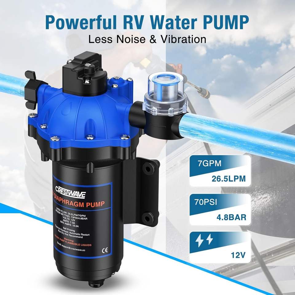 Bomba de Agua CrestWave de 12V CC, 7GPM, 70PSI, de 5 Cámaras, Autocebante, de Diafragma, para Uso Marino en Embarcaciones