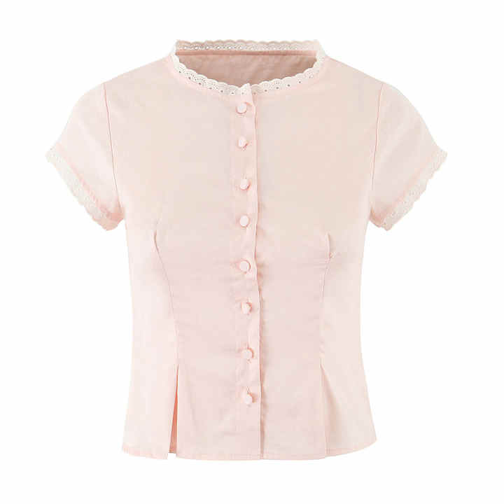 Blusa de Verano Informal de Algodón Tejido, Cuello Redondo, Manga Corta, Estilo Vintage, con Botones y Logotipo Frontal para Mujer