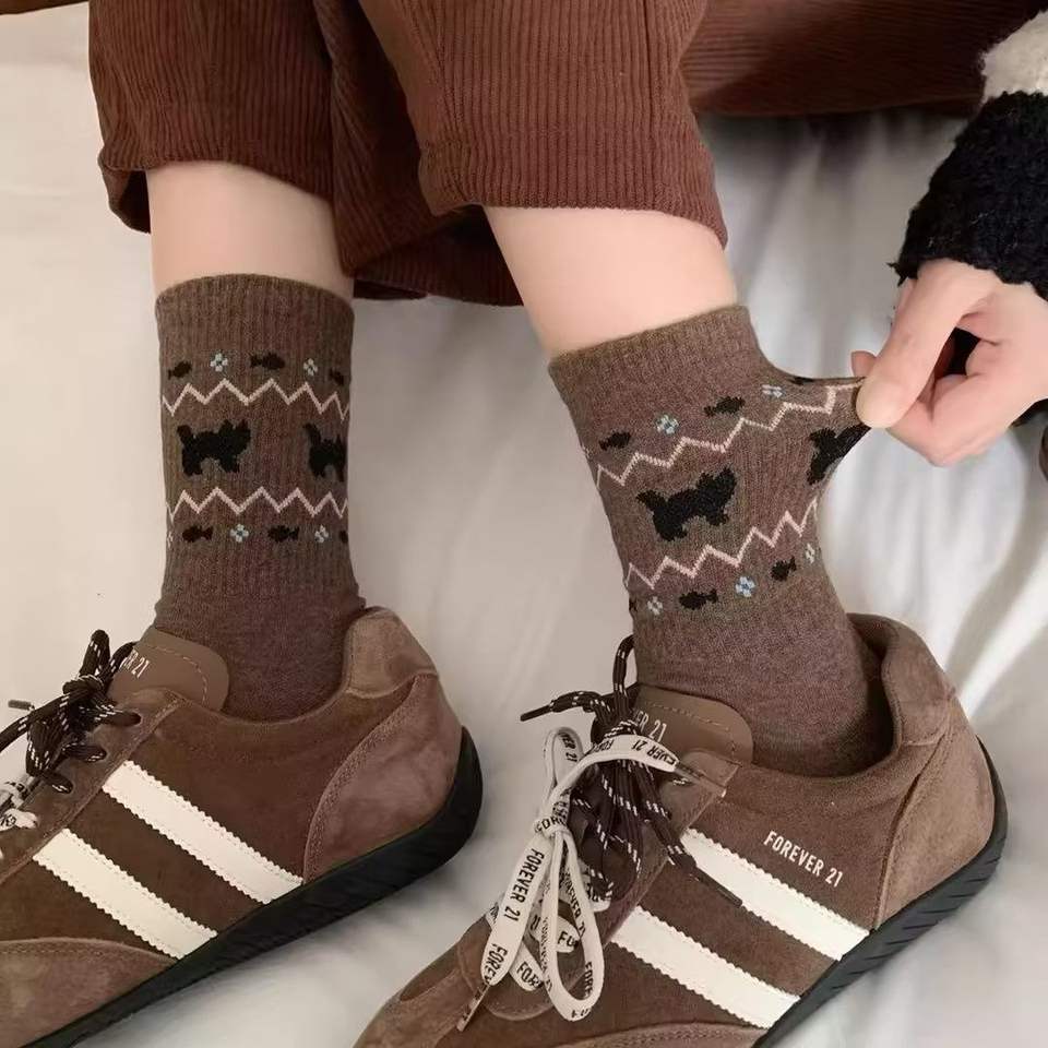 Calcetines de tripulación de longitud media con patrón Fair Isle, transpirables, que absorben el sudor, para mujeres, jóvenes, ropa informal, gris, marrón oscuro, marrón claro
