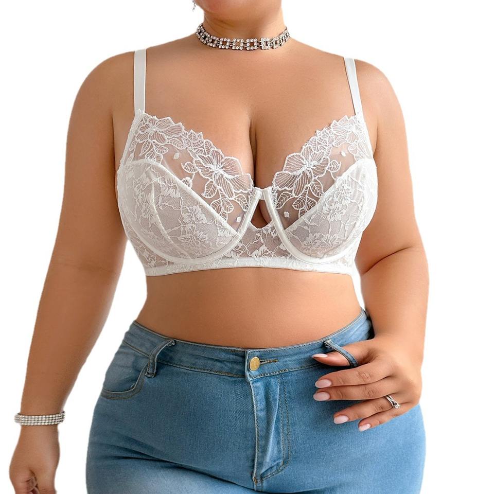 Sujetador con aros de acero para mujer, talla grande, con encaje hueco, malla fruncida, copa fina sin forro, para comercio exterior transfronterizo