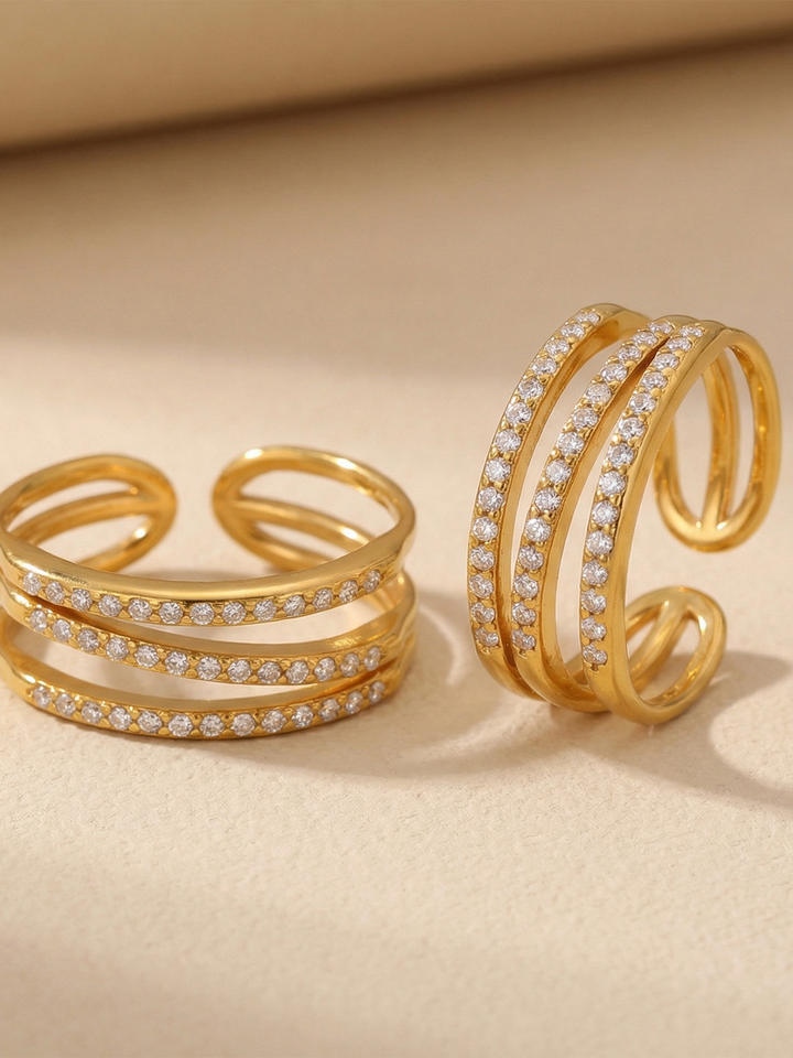 Cross Border Minimalist Design Micro Inlaid Lab Created Stones Three Layer Open Stainless Steel Gold Plated Fashion Unisex Ring