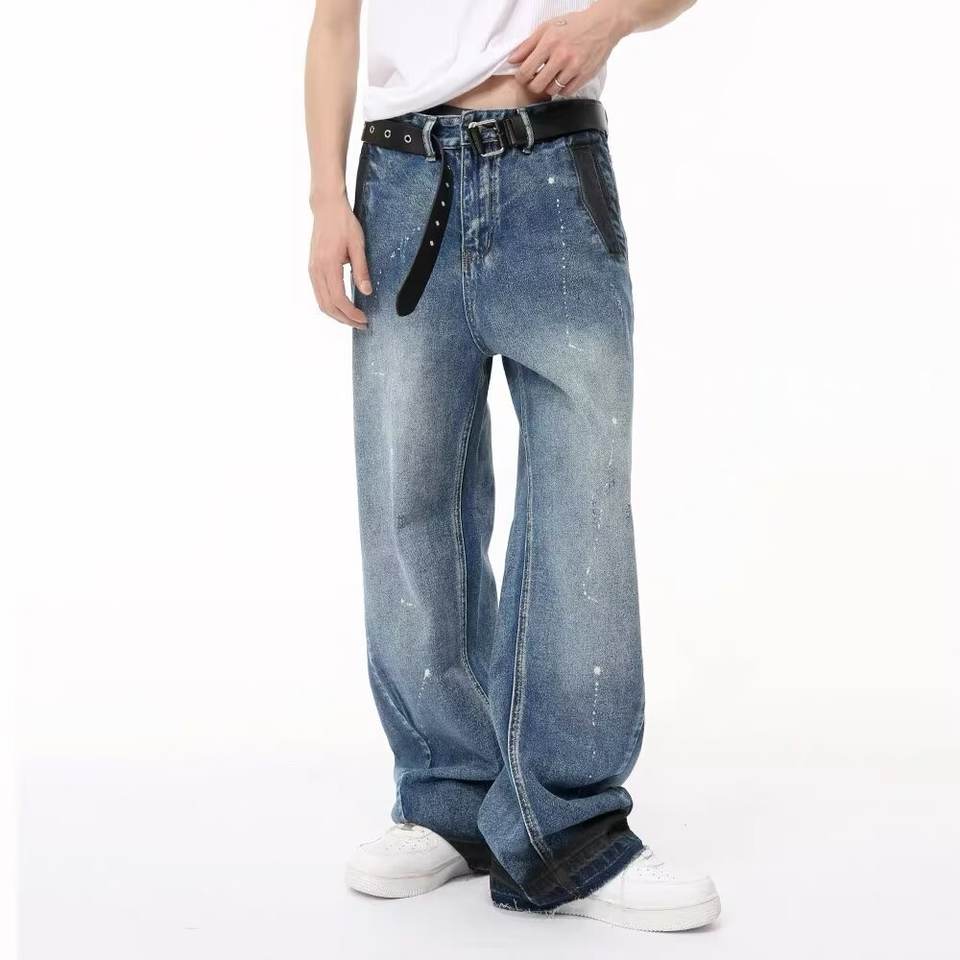 Jeans de Mezclilla de Corte Recto Holgados y Modernos con Salpicaduras de Tinta Azul para Hombre, Estilo Retro Americano, Lavado, de Primavera, Estilo Urbano