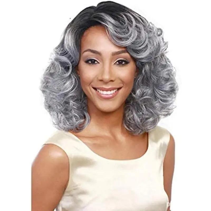Peluca de onda pequeña gris degradado nuevo transfronterizo, Pelo Rizado corto dividido medio de seda de alta temperatura de estilo europeo y americano M