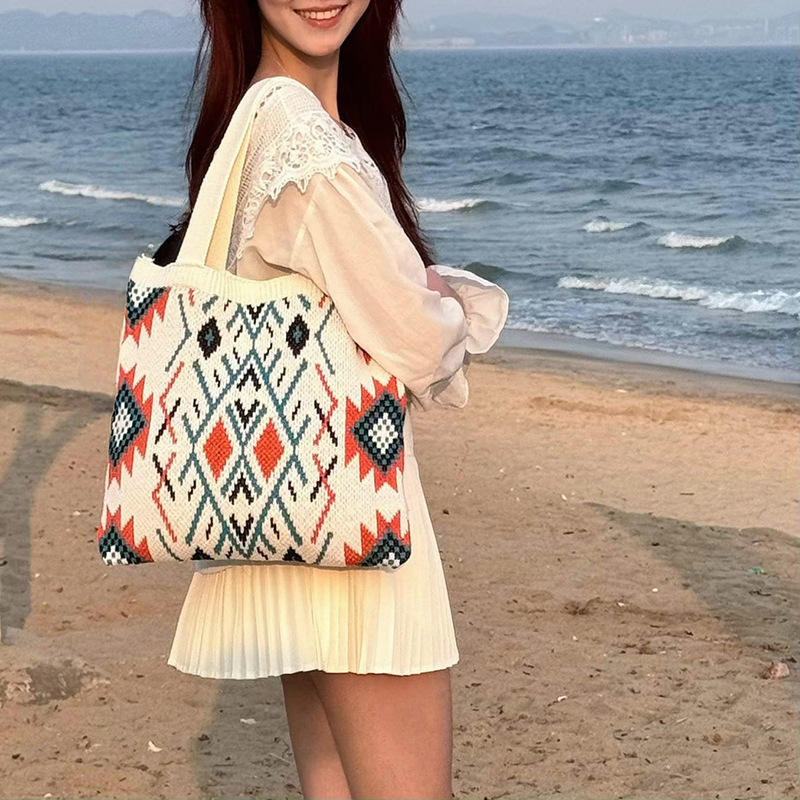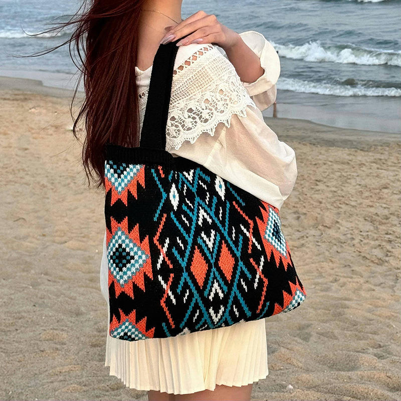 Bolso de Mano de Mujer Estilo Étnico con Texto Secreto Transfronterizo, Bolso Tote de Poliéster de Moda con Tejido de Dos Capas y Cierre Abierto de Gran Tamaño