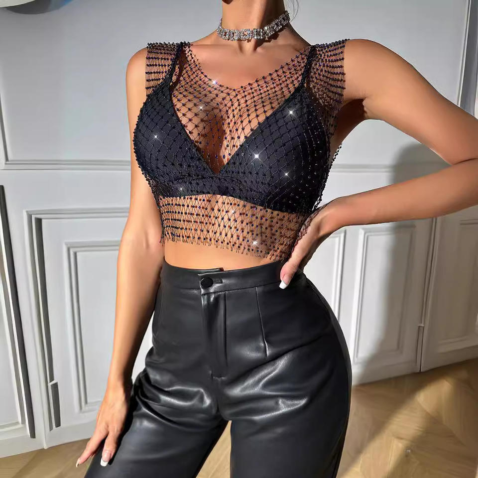 Suministro Transfronterizo 2026 AliExpress para Verano, Camiseta Corta Sexy de Malla con Diamantes Brillantes para Mujer, Estilo Discoteca, YX951
