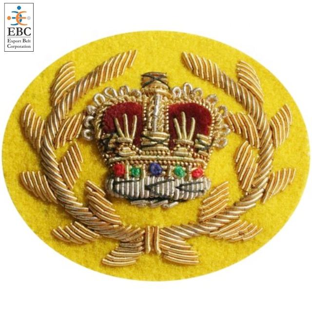 Corona sombrero insignia pecho parche moda mano bordado insignias textil artesanía oro tela lentejuelas bordado OEM