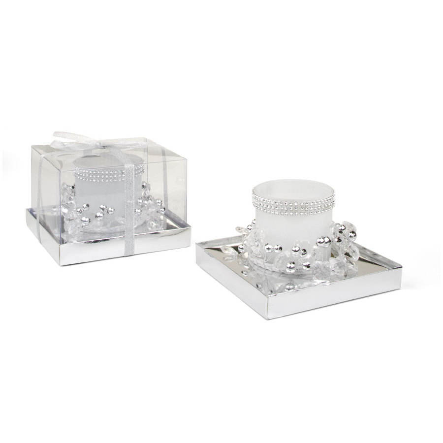 Juego de Portavelas de Cristal con Borde de Cuentas y Base Plateada, 65 mm de Diámetro, 75 mm de Altura, Incluye Elegante Empaque de Regalo