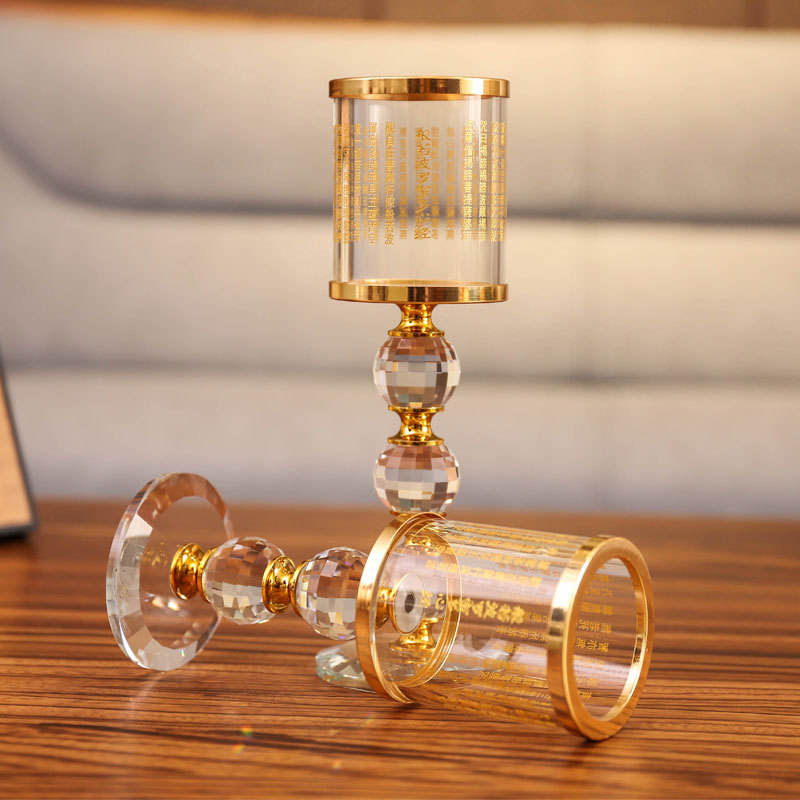 Candelero de cristal grabado con sutra para ofrenda a Buda, uso religioso en el hogar, cristal artificial amarillo 0602