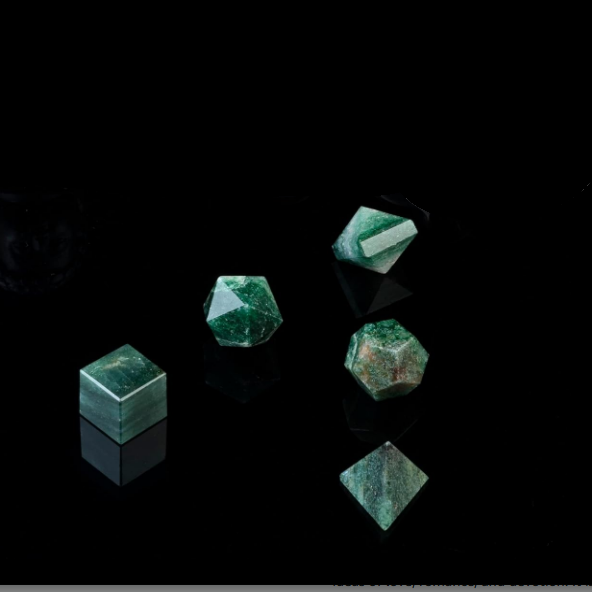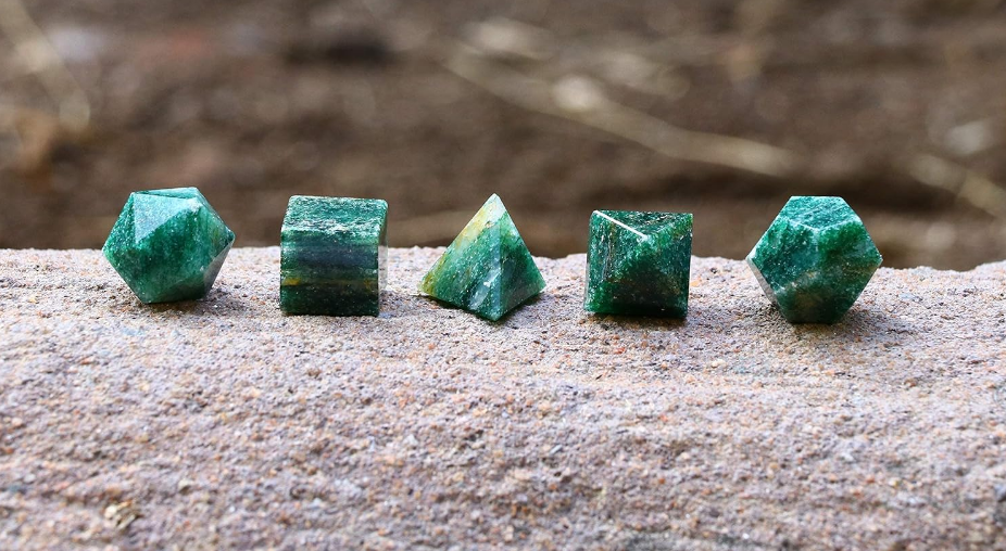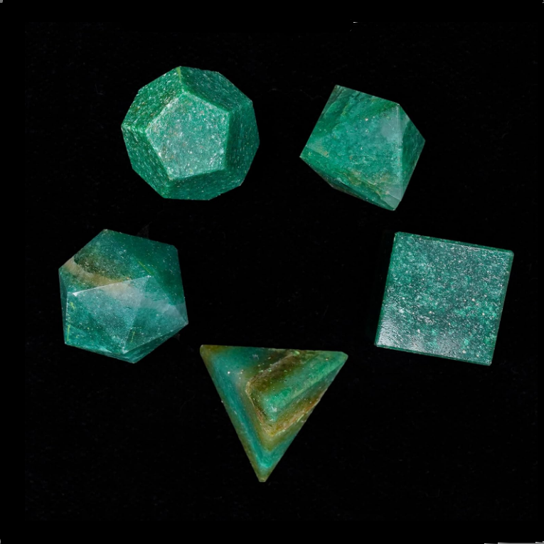 Juego de 5 piezas de geometría de mica verde de cristal, piedra natural sagrada tallada para curar sólidos platónicos, formas geométricas únicas