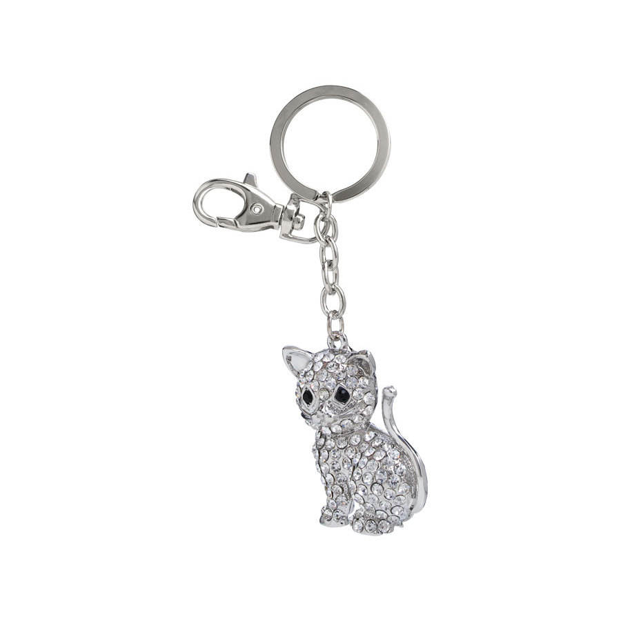 Llavero de cristal con forma de gatito y diamantes de imitación, colgante plateado para mujeres y niñas, accesorio de regalo
