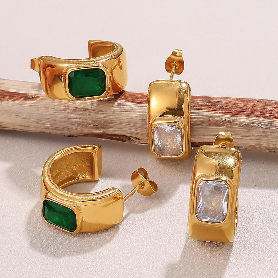 Pendientes de aro geométricos con circonita verde incrustada, chapados en oro de 18 quilates, de acero de titanio, para uso diario, joyería de moda.