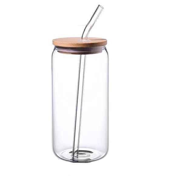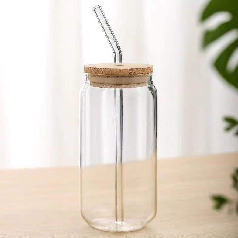 Vasos con Tapa de Bambú y Pajita de Vidrio de 500 ml, Juego de Botellas de Vidrio con Forma de Lata de 16 Onzas para Cerveza, Café Helado, Whisky