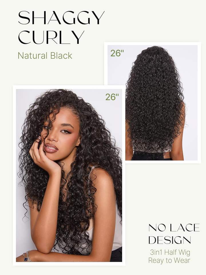 Peluca rizada de media cabeza de 24 pulgadas, cabello humano Remy, ondas desordenadas 3-1, con cordón ajustable, 200% de densidad, sin pegamento, natural